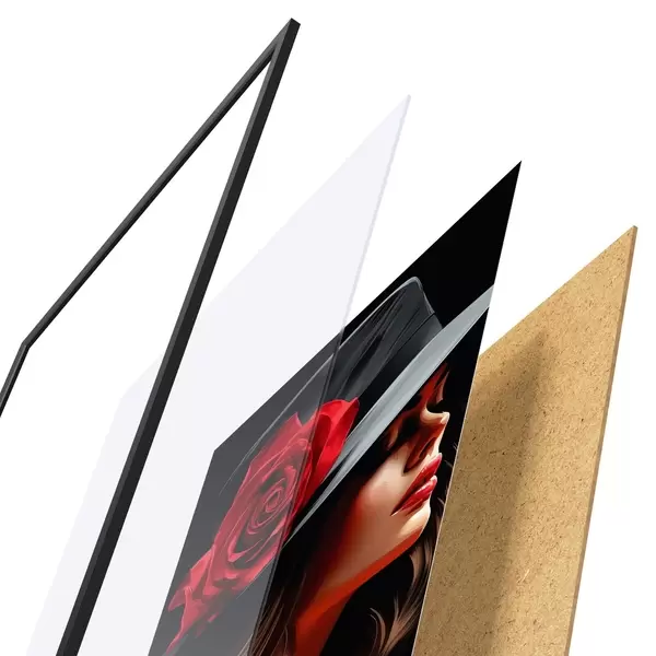 El póster consta de marco, plexiglás, imagen impresa y soporte de aglomerado. El póster puede colgarse inmediatamente en la pared gracias a los soportes de la parte posterior.