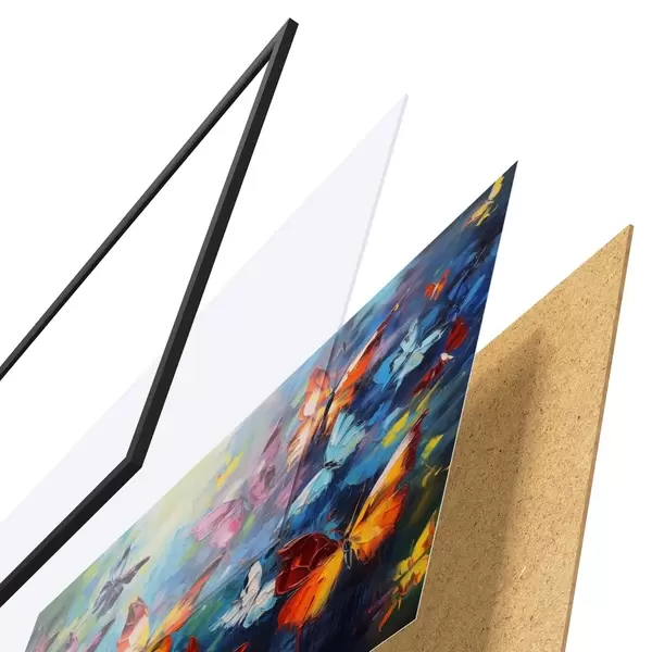 El póster consta de marco, plexiglás, imagen impresa y soporte de aglomerado. El póster puede colgarse inmediatamente en la pared gracias a los soportes de la parte posterior.