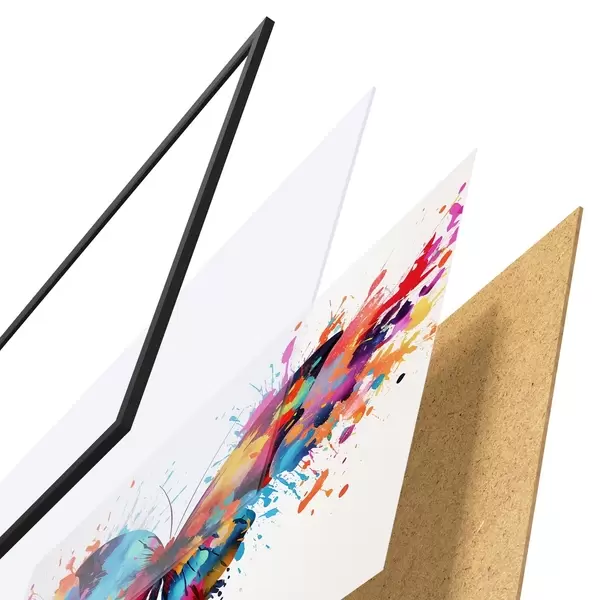 El póster consta de marco, plexiglás, imagen impresa y soporte de aglomerado. El póster puede colgarse inmediatamente en la pared gracias a los soportes de la parte posterior.
