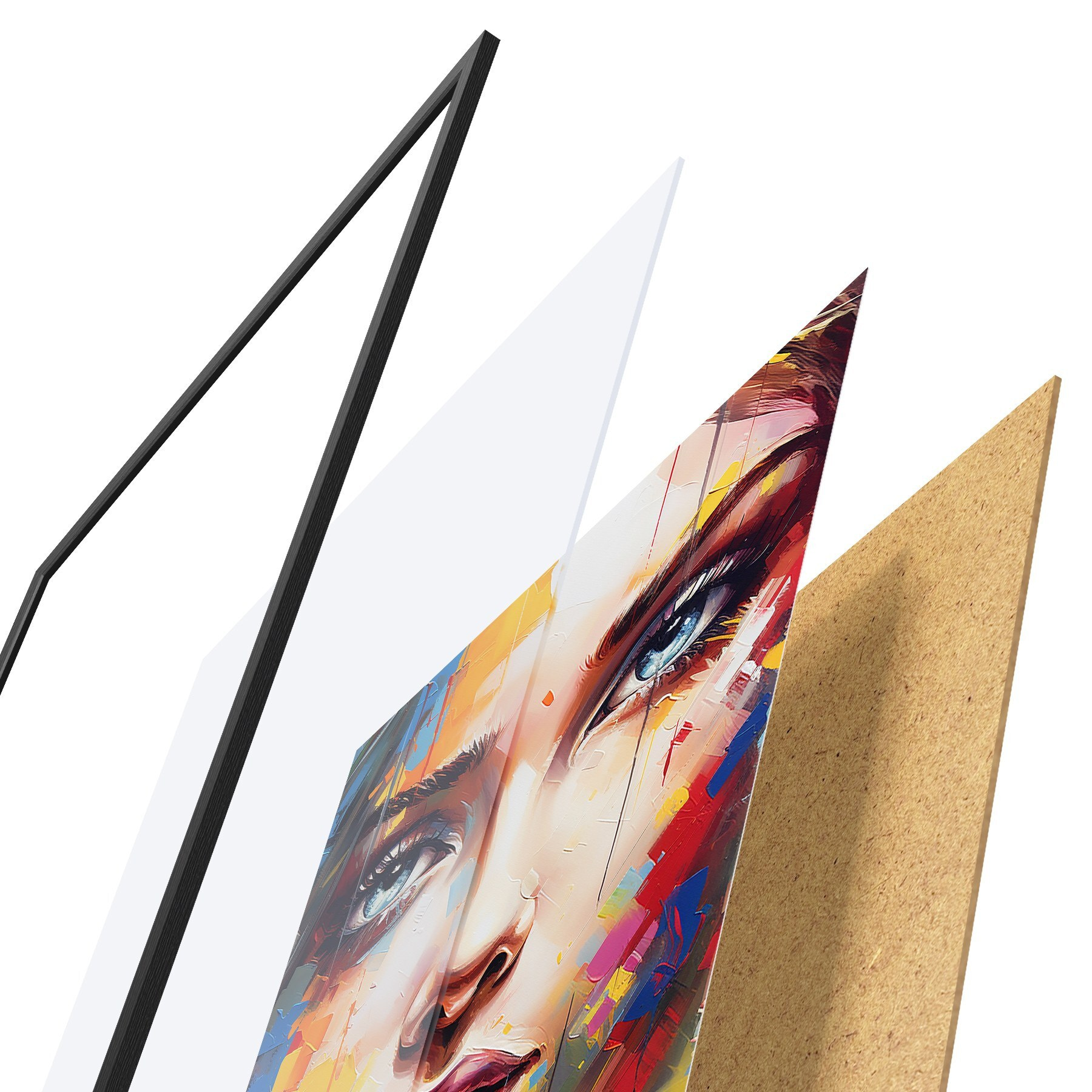 El póster consta de marco, plexiglás, imagen impresa y soporte de aglomerado. El póster puede colgarse inmediatamente en la pared gracias a los soportes de la parte posterior.