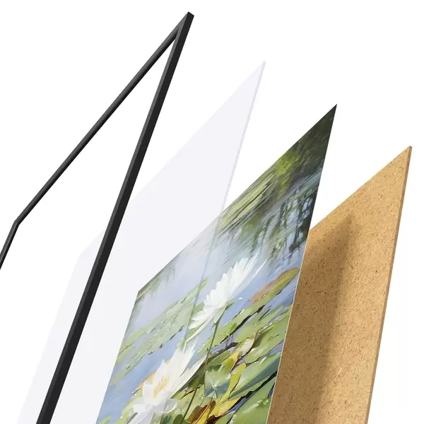 El póster consta de marco, plexiglás, imagen impresa y soporte de aglomerado. El póster puede colgarse inmediatamente en la pared gracias a los soportes de la parte posterior.