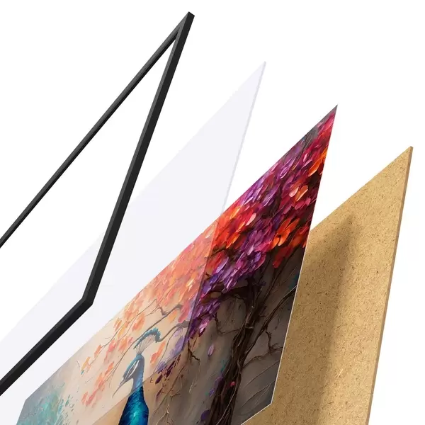 El póster consta de marco, plexiglás, imagen impresa y soporte de aglomerado. El póster puede colgarse inmediatamente en la pared gracias a los soportes de la parte posterior.