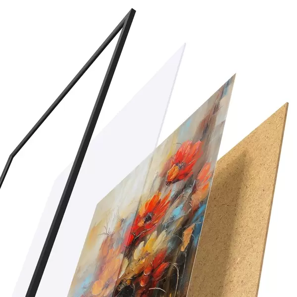 El póster consta de marco, plexiglás, imagen impresa y soporte de aglomerado. El póster puede colgarse inmediatamente en la pared gracias a los soportes de la parte posterior.