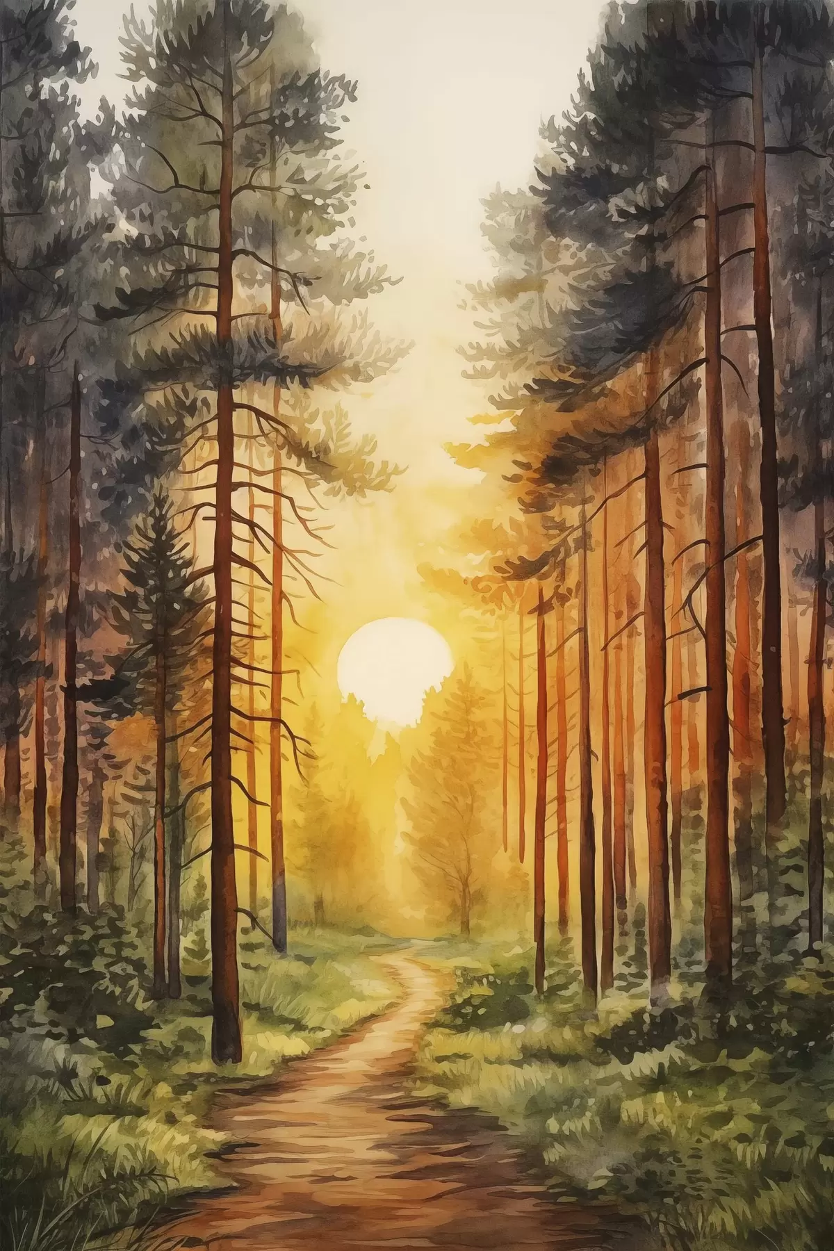 Poster Puesta de sol en el bosque de pinos, acuarela, belleza de la naturaleza Nr f41638