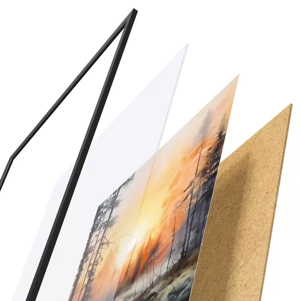 El póster consta de marco, plexiglás, imagen impresa y soporte de aglomerado. El póster puede colgarse inmediatamente en la pared gracias a los soportes de la parte posterior.