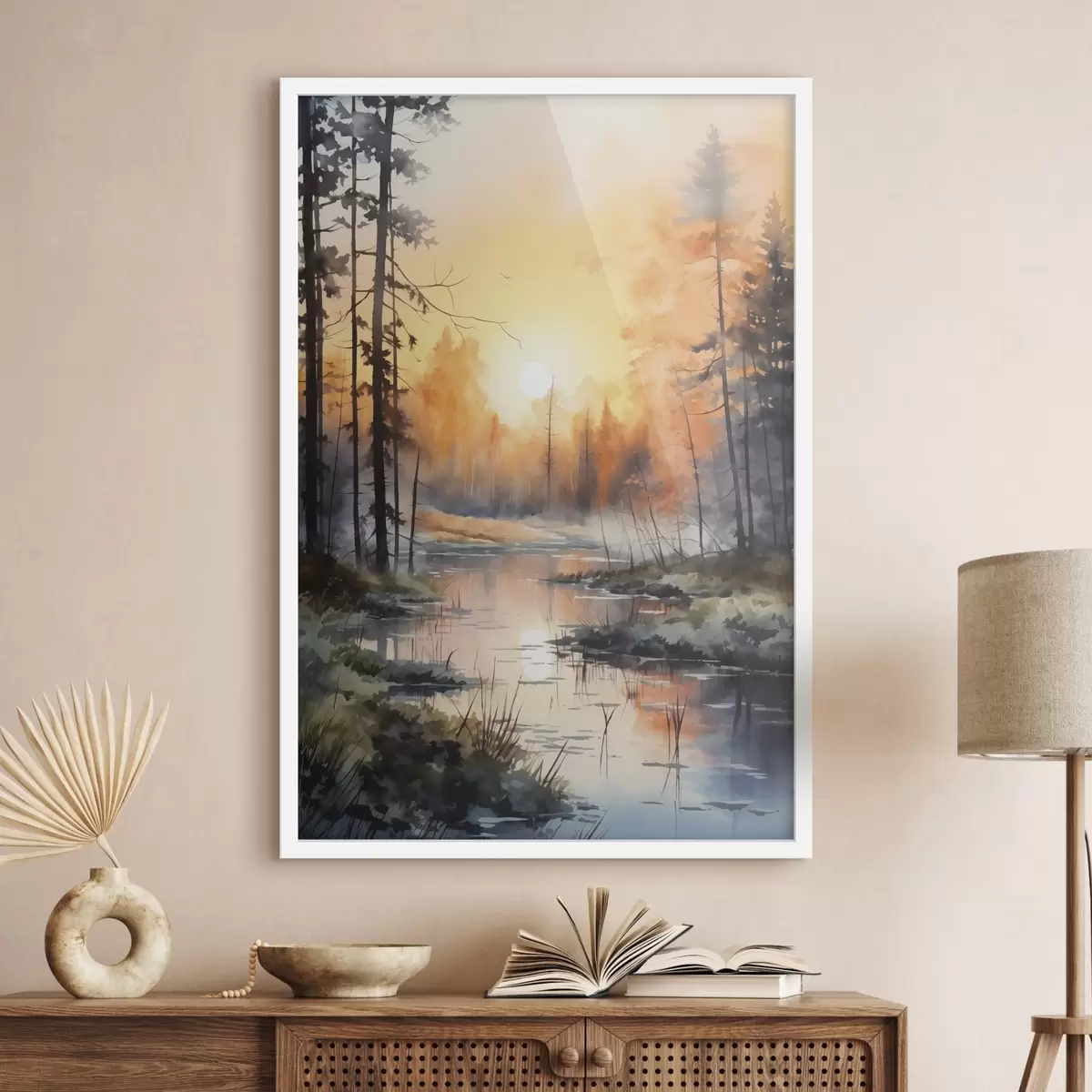 Poster Lago en el bosque, acuarela, colores de otoño, niebla, cielo al atardecer Nr f41642