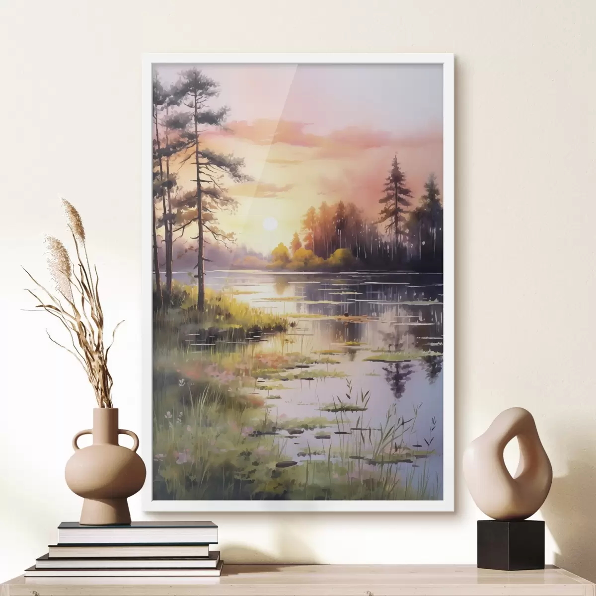 Poster Amanecer en el lago del bosque, acuarela, árboles, flores, luz suave f41644