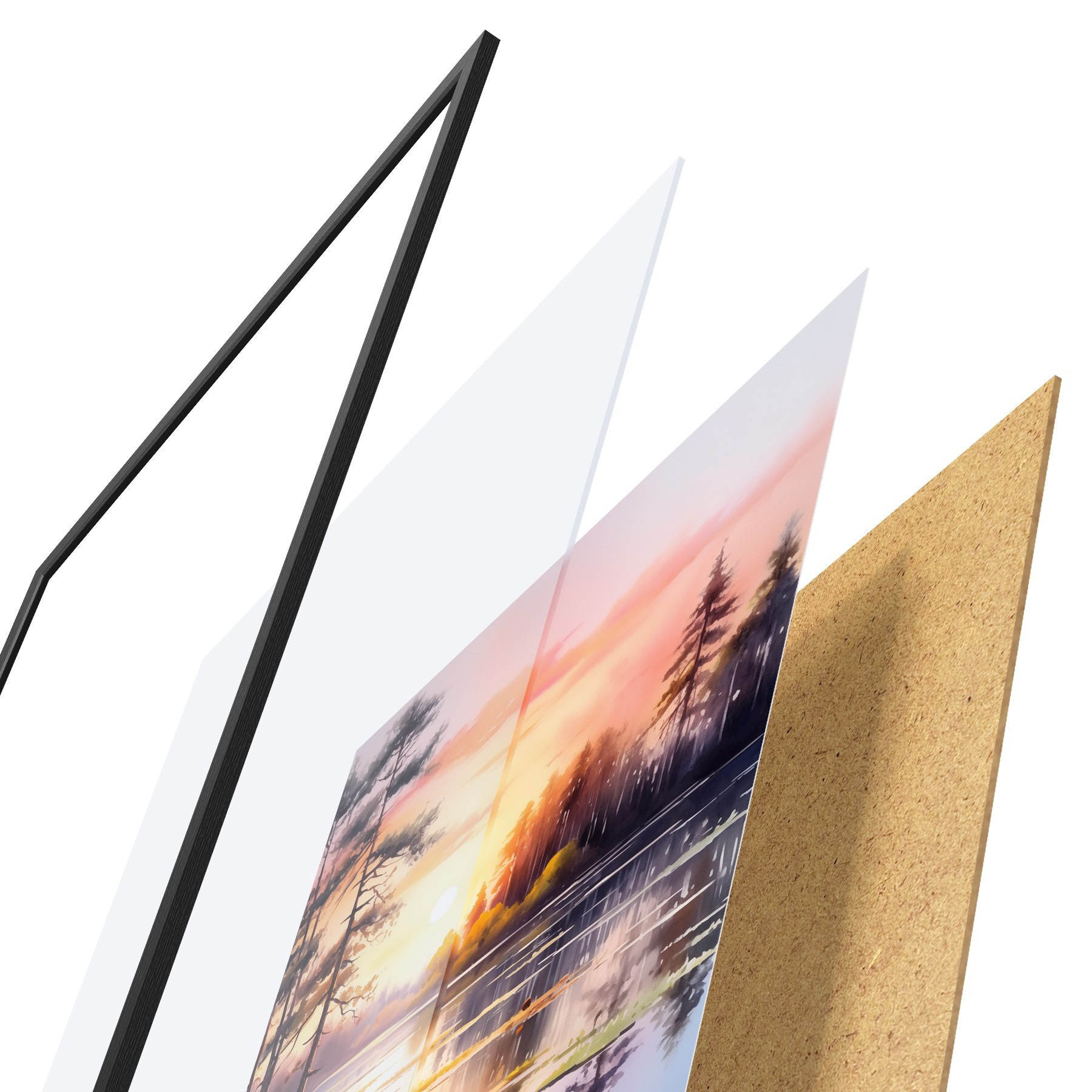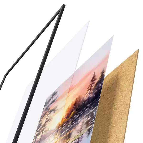 El póster consta de marco, plexiglás, imagen impresa y soporte de aglomerado. El póster puede colgarse inmediatamente en la pared gracias a los soportes de la parte posterior.