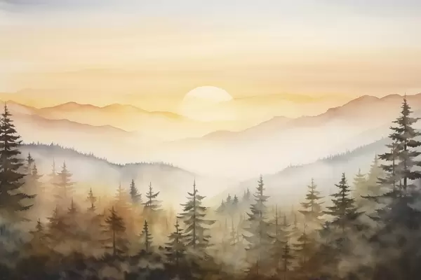 Poster Paisaje otoñal de montaña, bosque de pinos, puesta de sol, acuarela Nr f41645