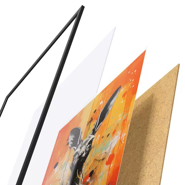 El póster consta de marco, plexiglás, imagen impresa y soporte de aglomerado. El póster puede colgarse inmediatamente en la pared gracias a los soportes de la parte posterior.
