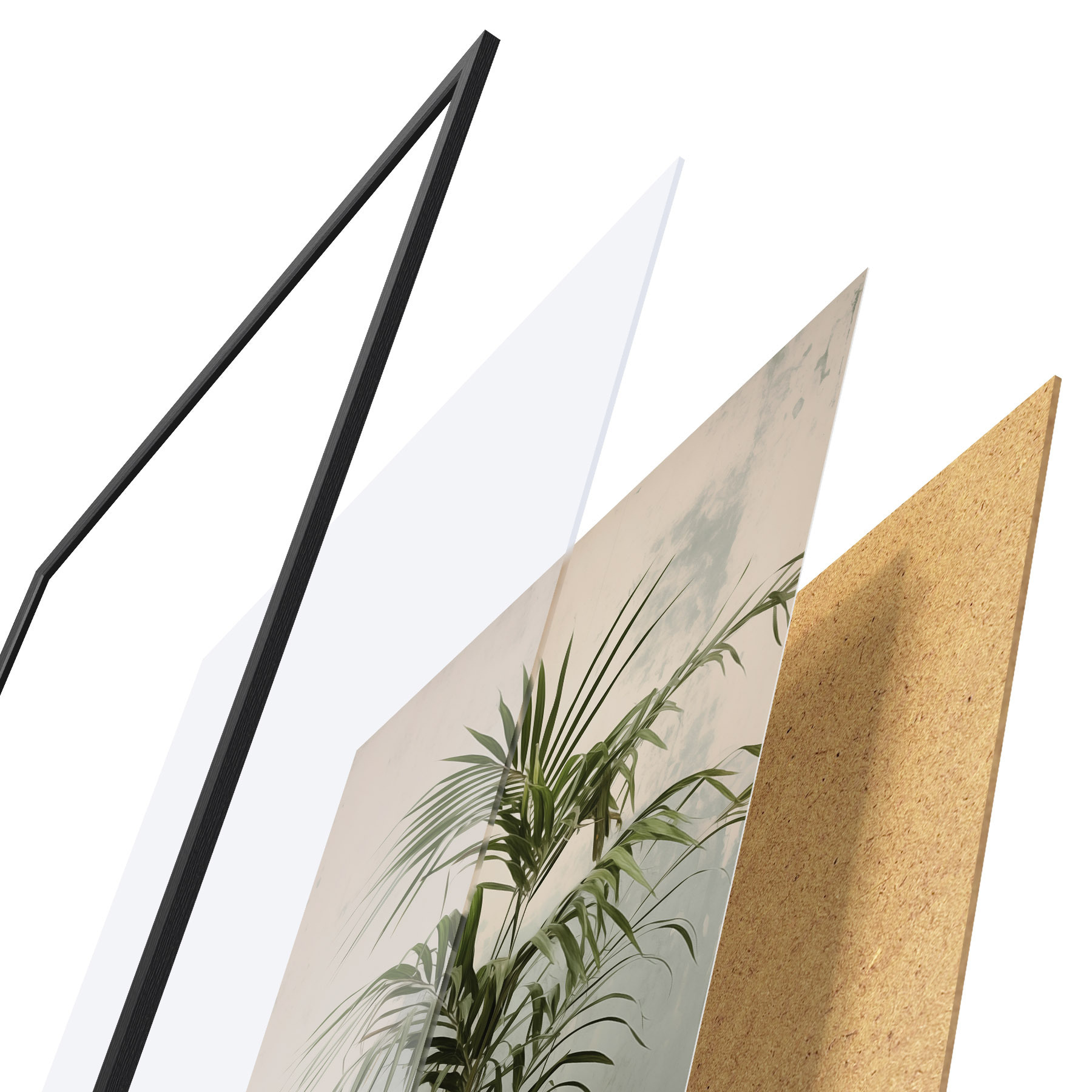 El póster consta de marco, plexiglás, imagen impresa y soporte de aglomerado. El póster puede colgarse inmediatamente en la pared gracias a los soportes de la parte posterior.