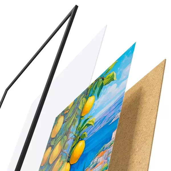 El póster consta de marco, plexiglás, imagen impresa y soporte de aglomerado. El póster puede colgarse inmediatamente en la pared gracias a los soportes de la parte posterior.