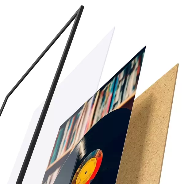 El póster consta de marco, plexiglás, imagen impresa y soporte de aglomerado. El póster puede colgarse inmediatamente en la pared gracias a los soportes de la parte posterior.