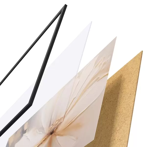 El póster consta de marco, plexiglás, imagen impresa y soporte de aglomerado. El póster puede colgarse inmediatamente en la pared gracias a los soportes de la parte posterior.