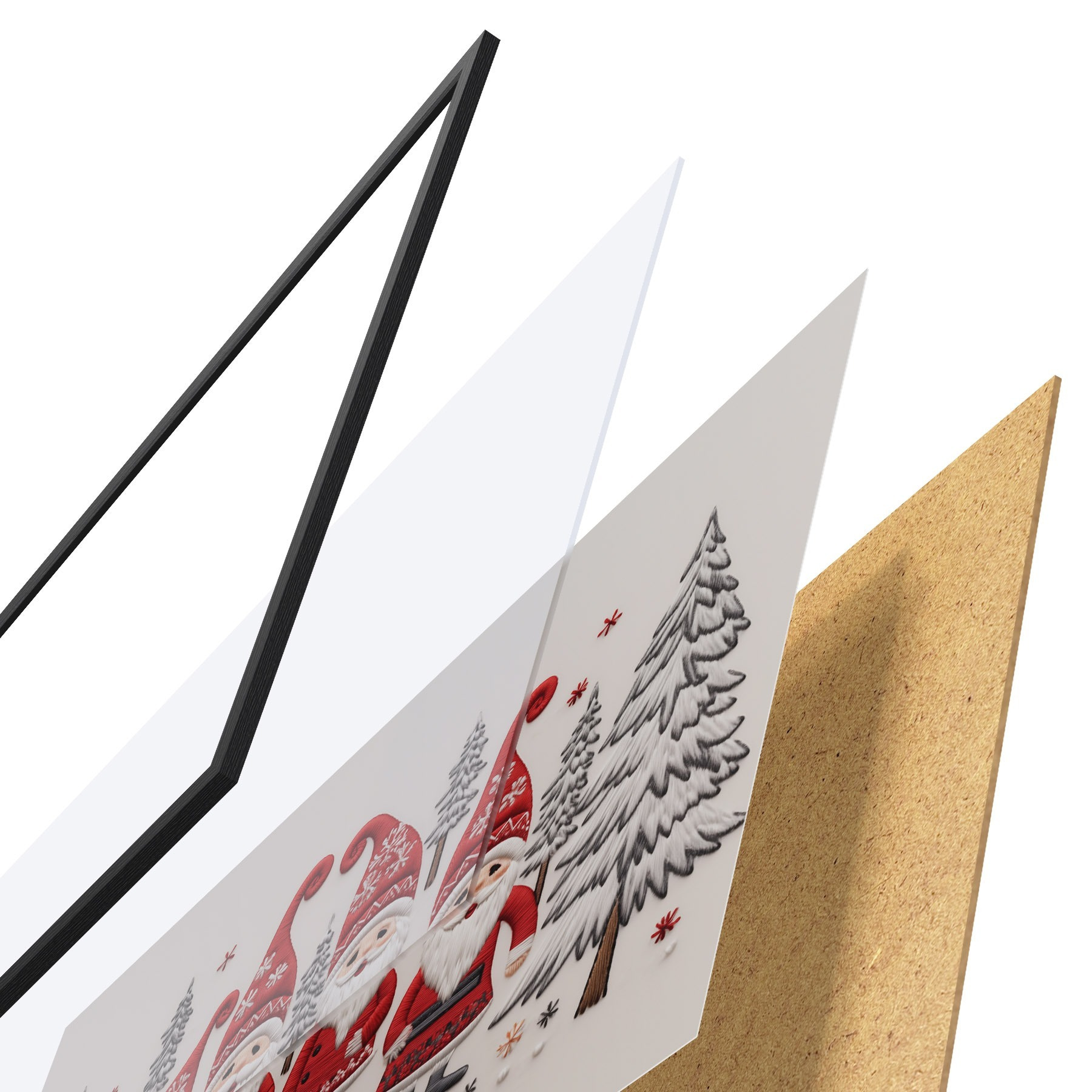 El póster consta de marco, plexiglás, imagen impresa y soporte de aglomerado. El póster puede colgarse inmediatamente en la pared gracias a los soportes de la parte posterior.