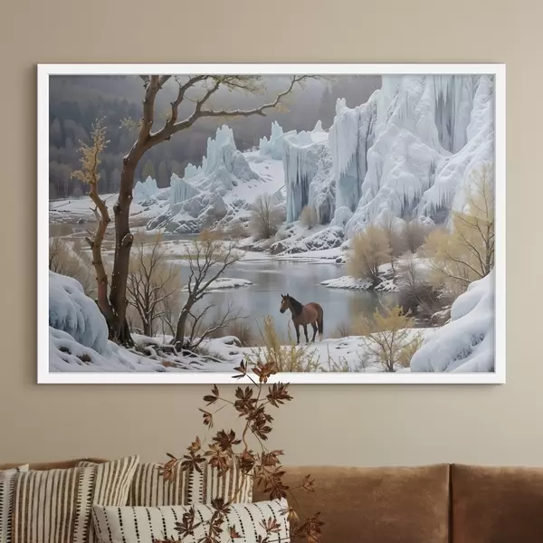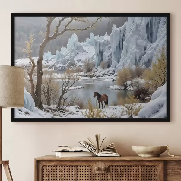Poster Un paisaje invernal nevado con un lago helado, imponentes acantilados de hielo y un caballo de pie en primer plano Nr f41716