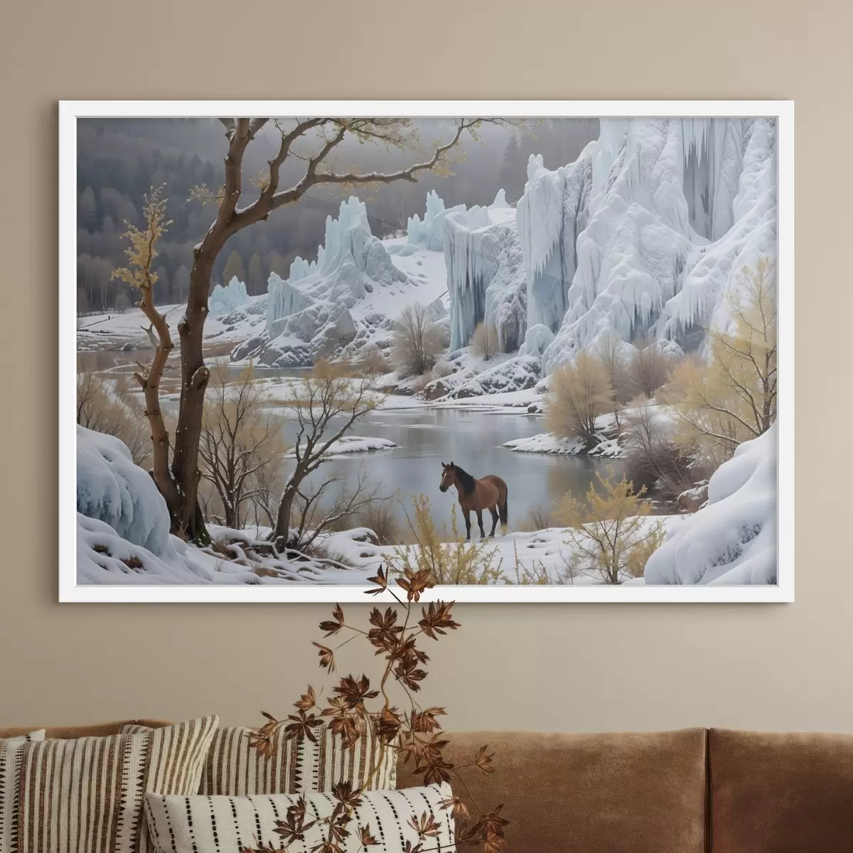 Poster Un paisaje invernal nevado con un lago helado, imponentes acantilados de hielo y un caballo de pie en primer plano f41716