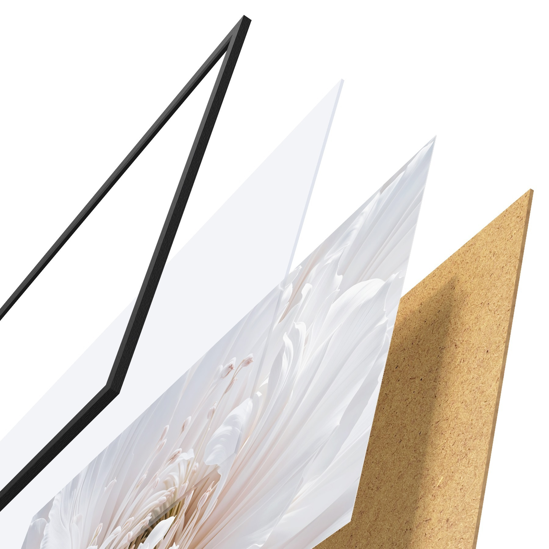 El póster consta de marco, plexiglás, imagen impresa y soporte de aglomerado. El póster puede colgarse inmediatamente en la pared gracias a los soportes de la parte posterior.