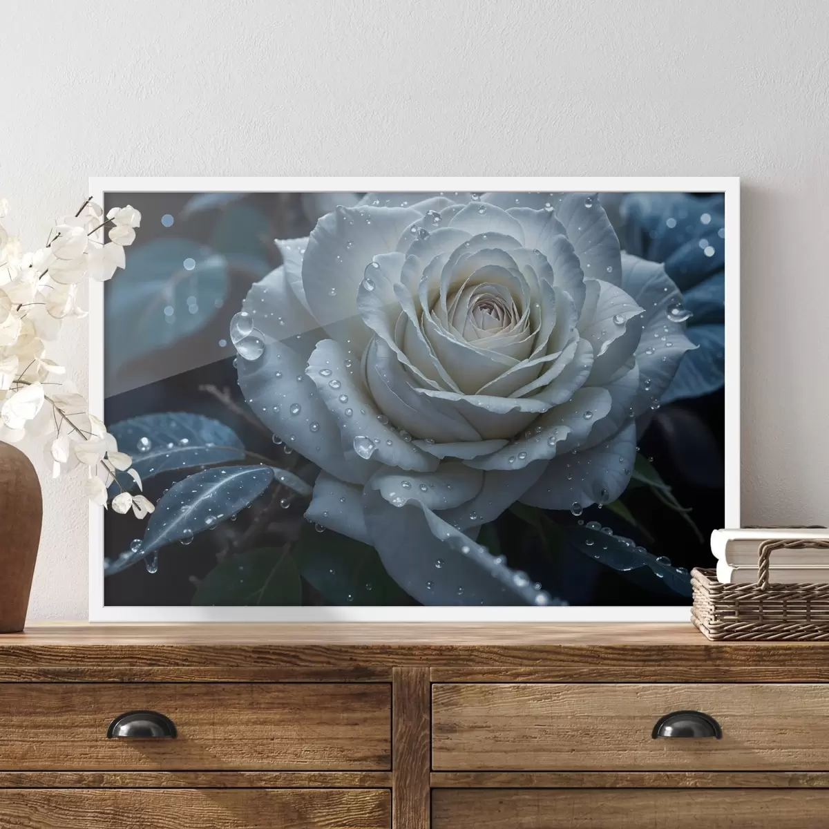 Poster Primer plano de una rosa blanca con gotas de agua en sus pétalos, sobre un fondo oscuro f41723