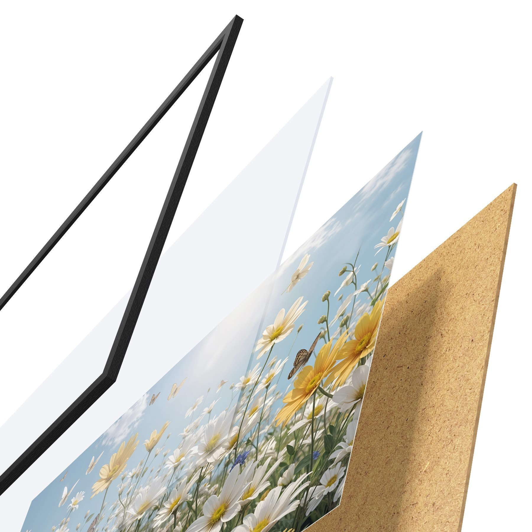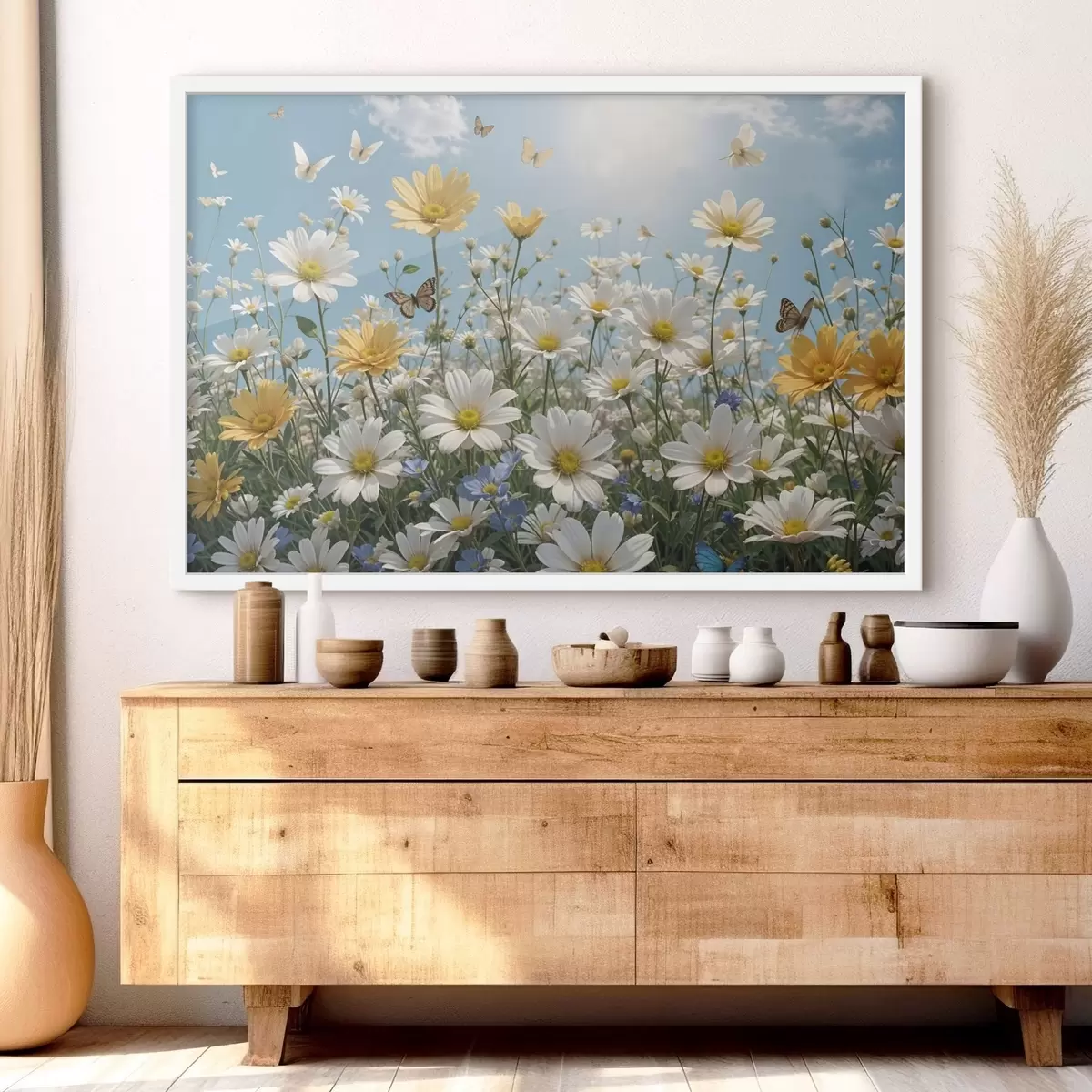 Poster Un campo de margaritas blancas y amarillas sobre un cielo azul con esponjosas nubes blancas y mariposas volando por encima Nr f41726