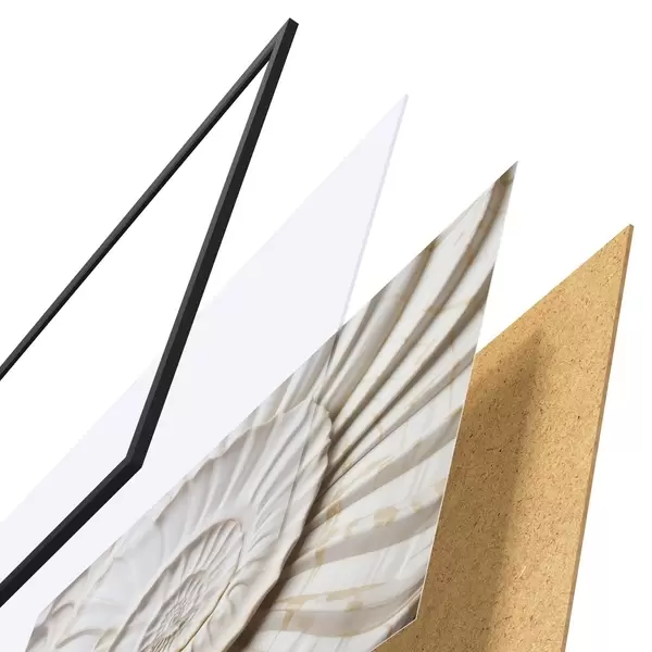 El póster consta de marco, plexiglás, imagen impresa y soporte de aglomerado. El póster puede colgarse inmediatamente en la pared gracias a los soportes de la parte posterior.