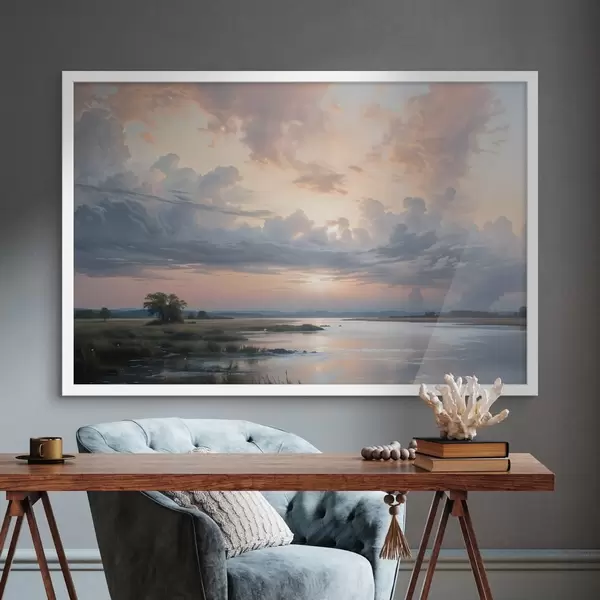 Poster Un sereno paisaje de colores pastel con un tranquilo lago que refleja el colorido cielo al atardecer f41734