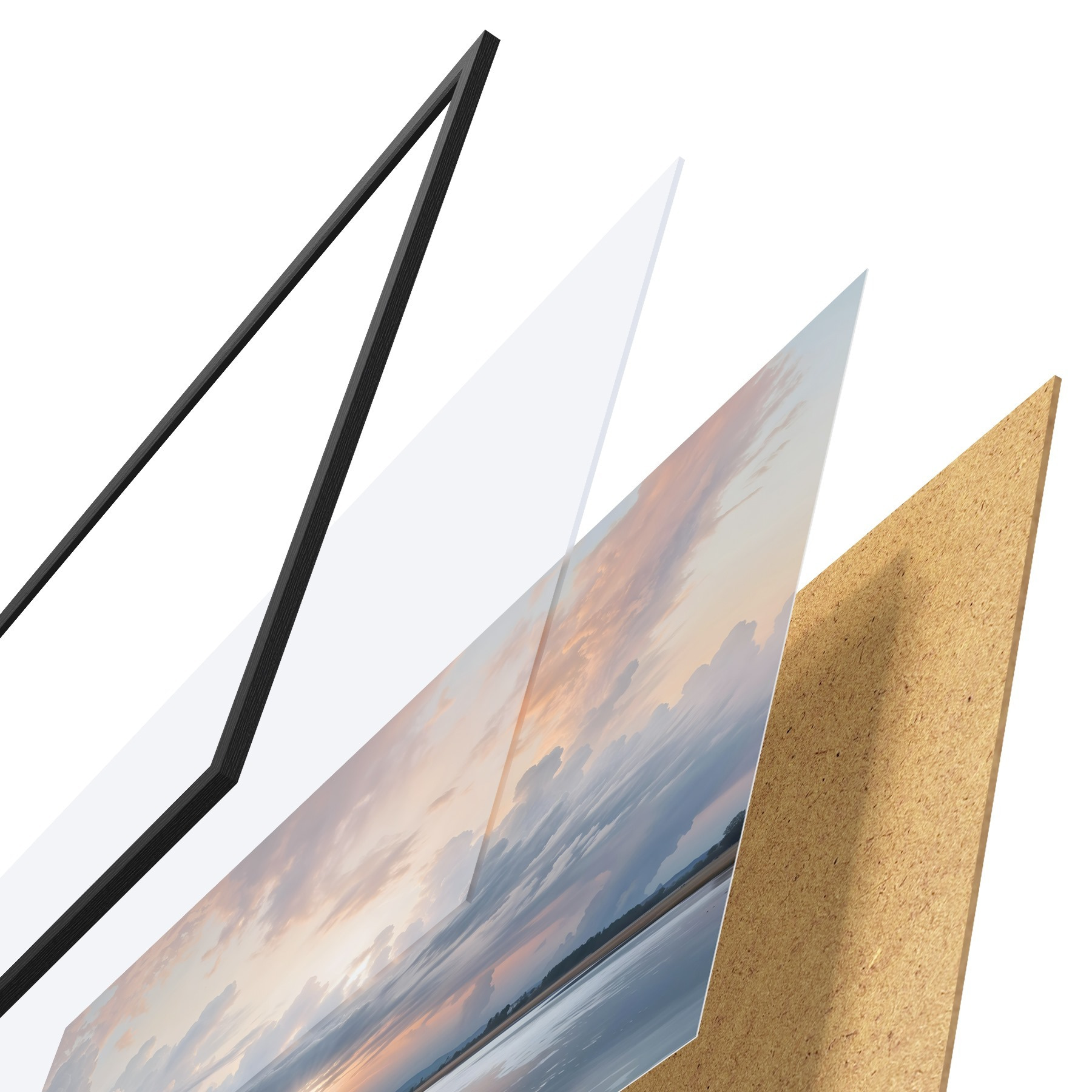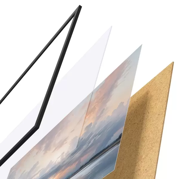El póster consta de marco, plexiglás, imagen impresa y soporte de aglomerado. El póster puede colgarse inmediatamente en la pared gracias a los soportes de la parte posterior.