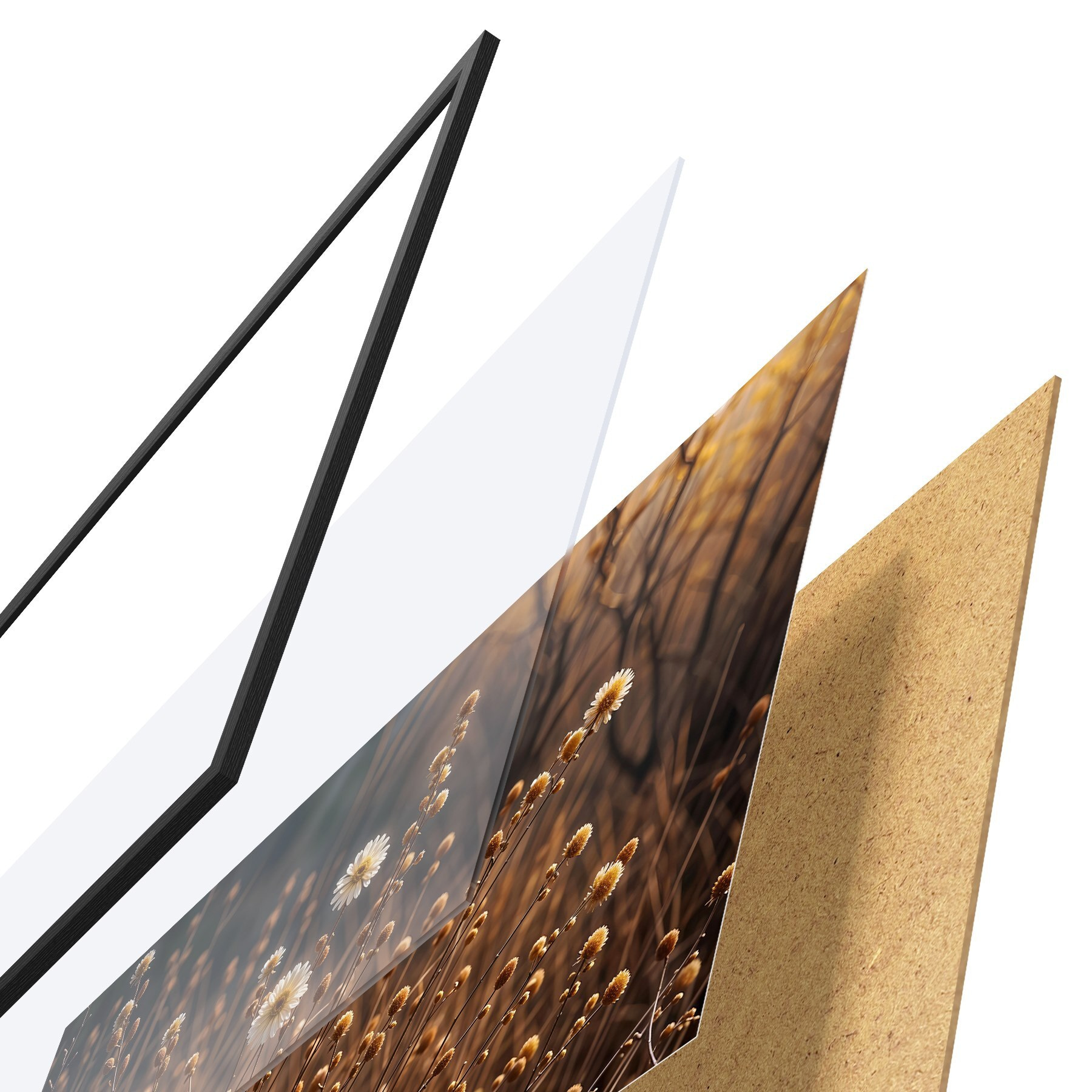 Poster Margaritas blancas en un campo de hierba seca y tallos, con la cálida luz del sol del atardecer Nr f41735