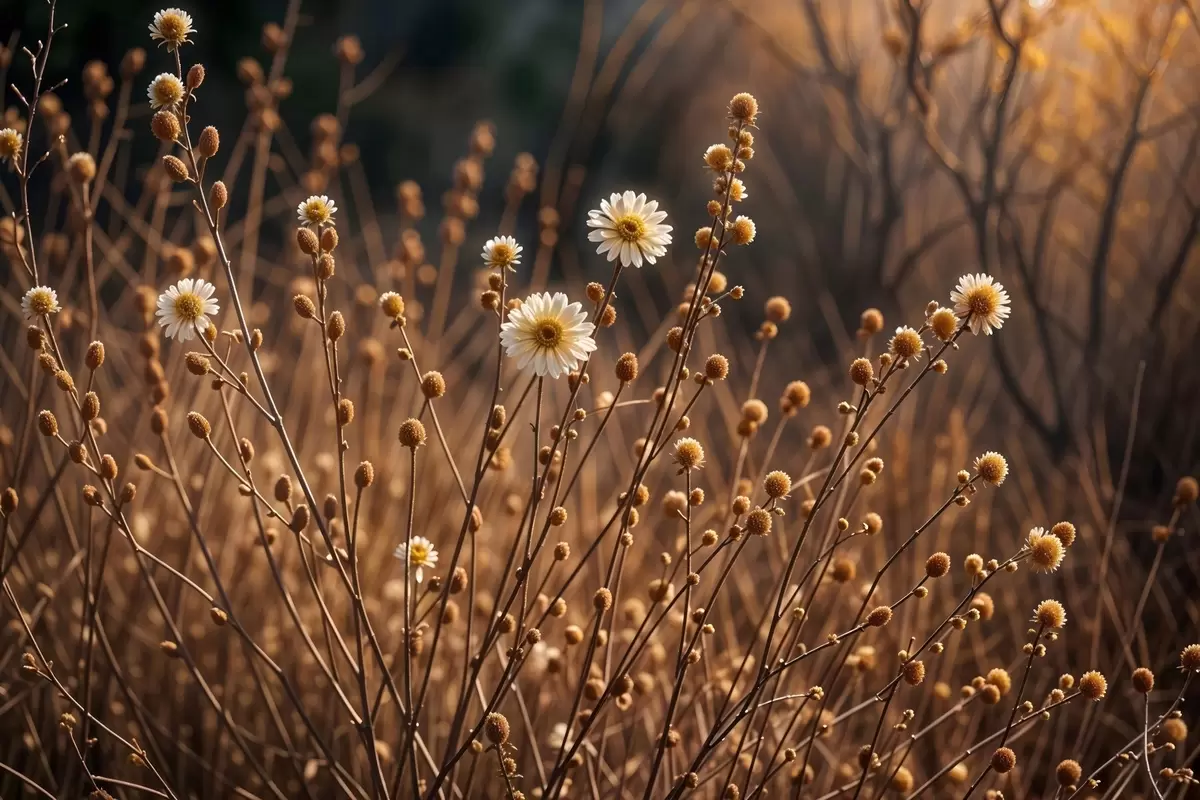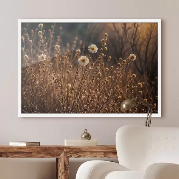 Poster Margaritas blancas en un campo de hierba seca y tallos, con la cálida luz del sol del atardecer Nr f41735