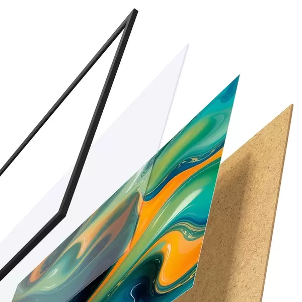 El póster consta de marco, plexiglás, imagen impresa y soporte de aglomerado. El póster puede colgarse inmediatamente en la pared gracias a los soportes de la parte posterior.