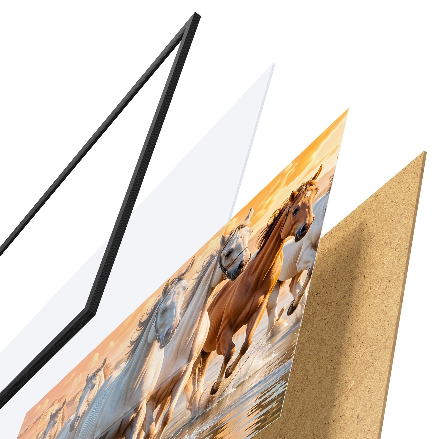 Poster Una manada de caballos blancos corriendo por aguas poco profundas, con un cielo anaranjado de fondo f41740
