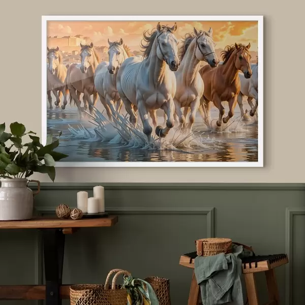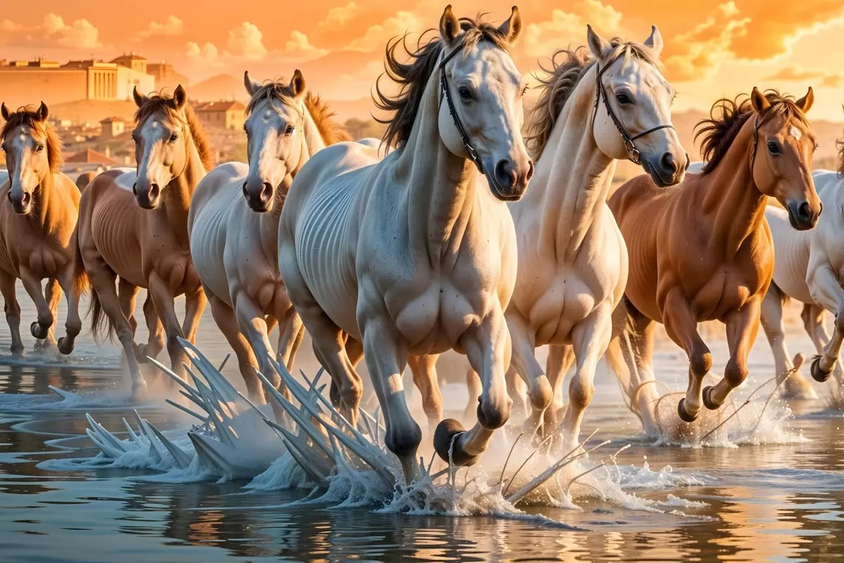 Poster Una manada de caballos blancos corriendo por aguas poco profundas, con un cielo anaranjado de fondo f41740