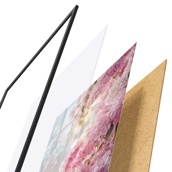 El póster consta de marco, plexiglás, imagen impresa y soporte de aglomerado. El póster puede colgarse inmediatamente en la pared gracias a los soportes de la parte posterior.