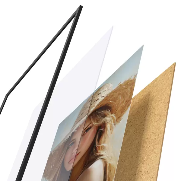 El póster consta de marco, plexiglás, imagen impresa y soporte de aglomerado. El póster puede colgarse inmediatamente en la pared gracias a los soportes de la parte posterior.
