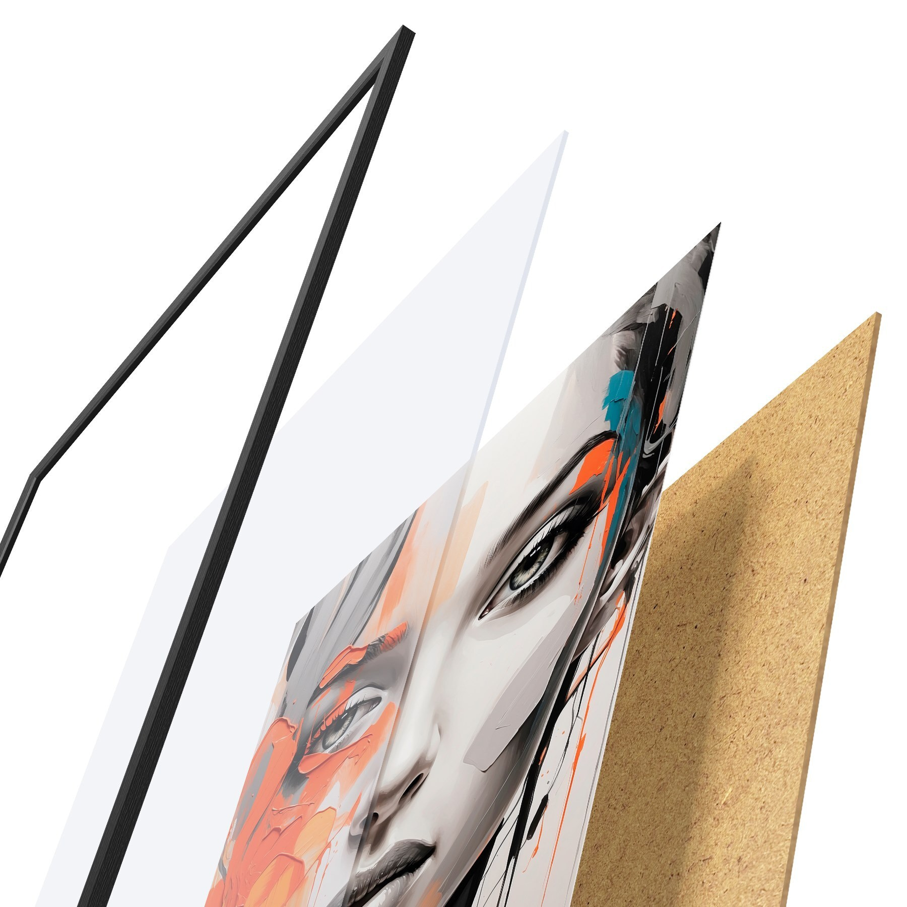 El póster consta de marco, plexiglás, imagen impresa y soporte de aglomerado. El póster puede colgarse inmediatamente en la pared gracias a los soportes de la parte posterior.