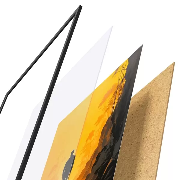 El póster consta de marco, plexiglás, imagen impresa y soporte de aglomerado. El póster puede colgarse inmediatamente en la pared gracias a los soportes de la parte posterior.