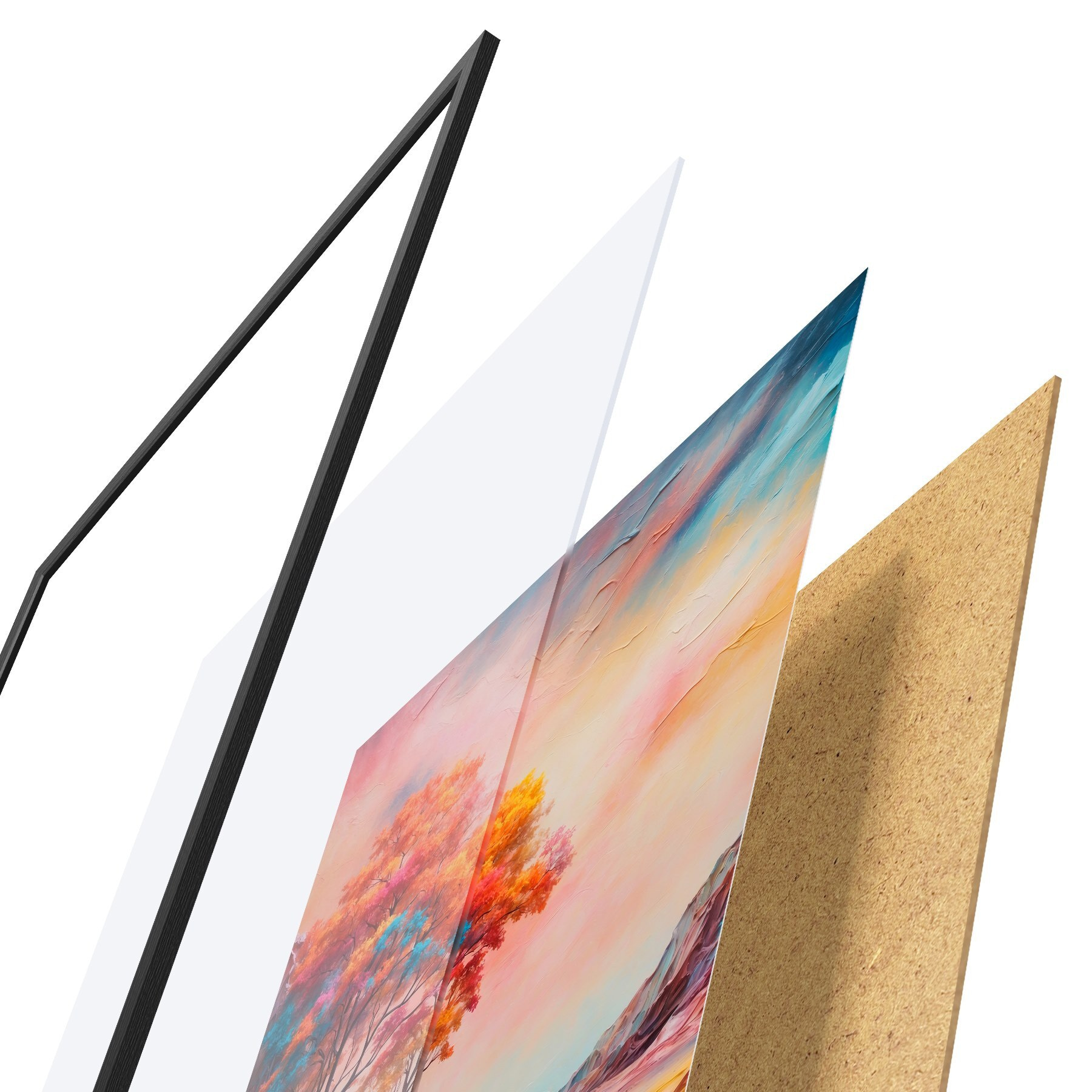 El póster consta de marco, plexiglás, imagen impresa y soporte de aglomerado. El póster puede colgarse inmediatamente en la pared gracias a los soportes de la parte posterior.