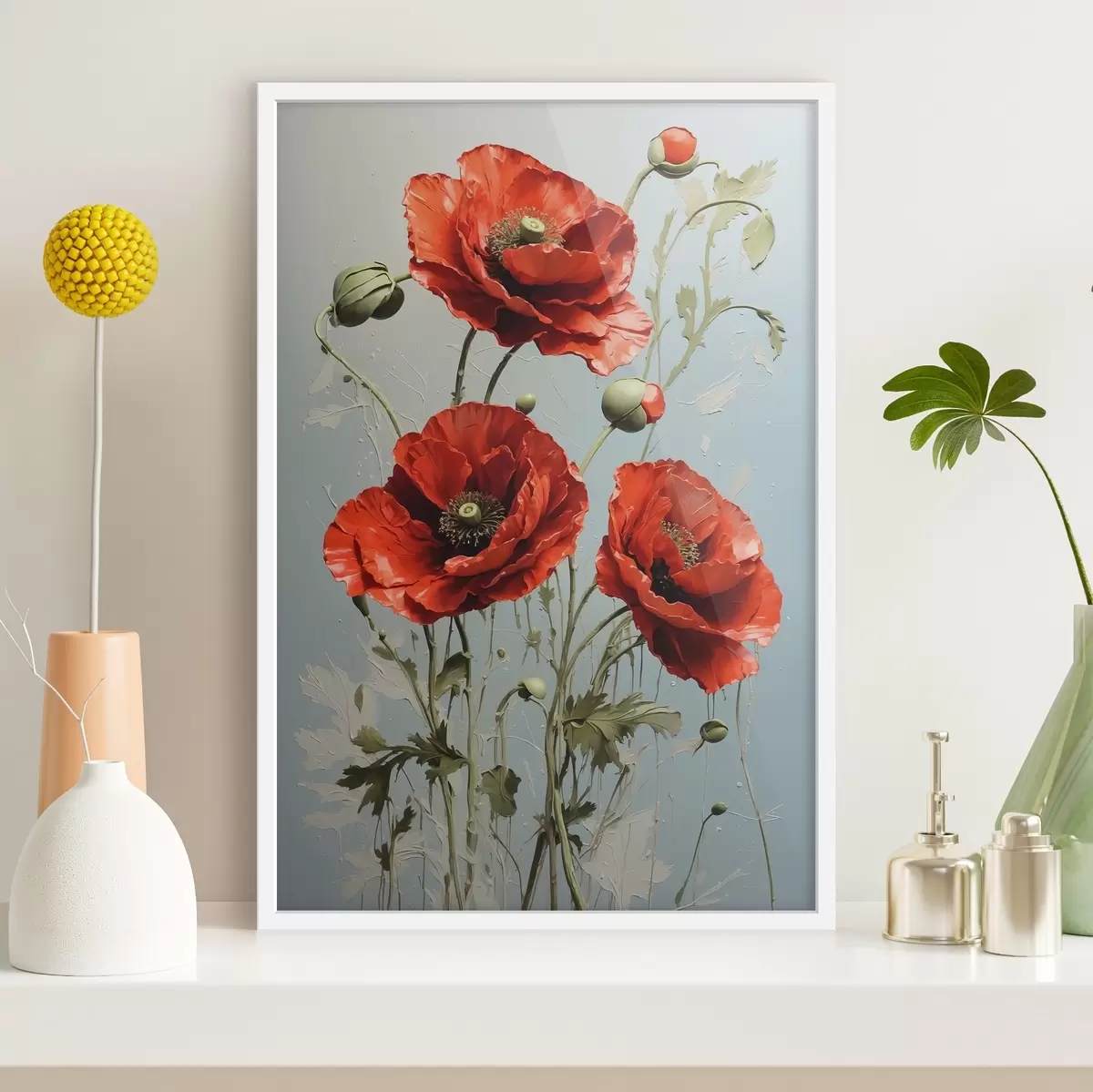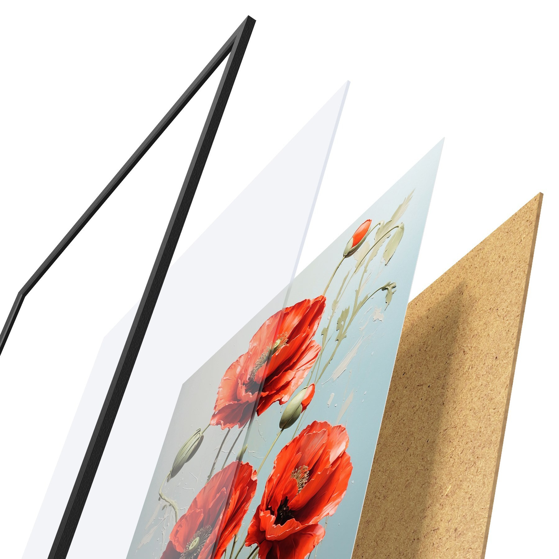 El póster consta de marco, plexiglás, imagen impresa y soporte de aglomerado. El póster puede colgarse inmediatamente en la pared gracias a los soportes de la parte posterior.