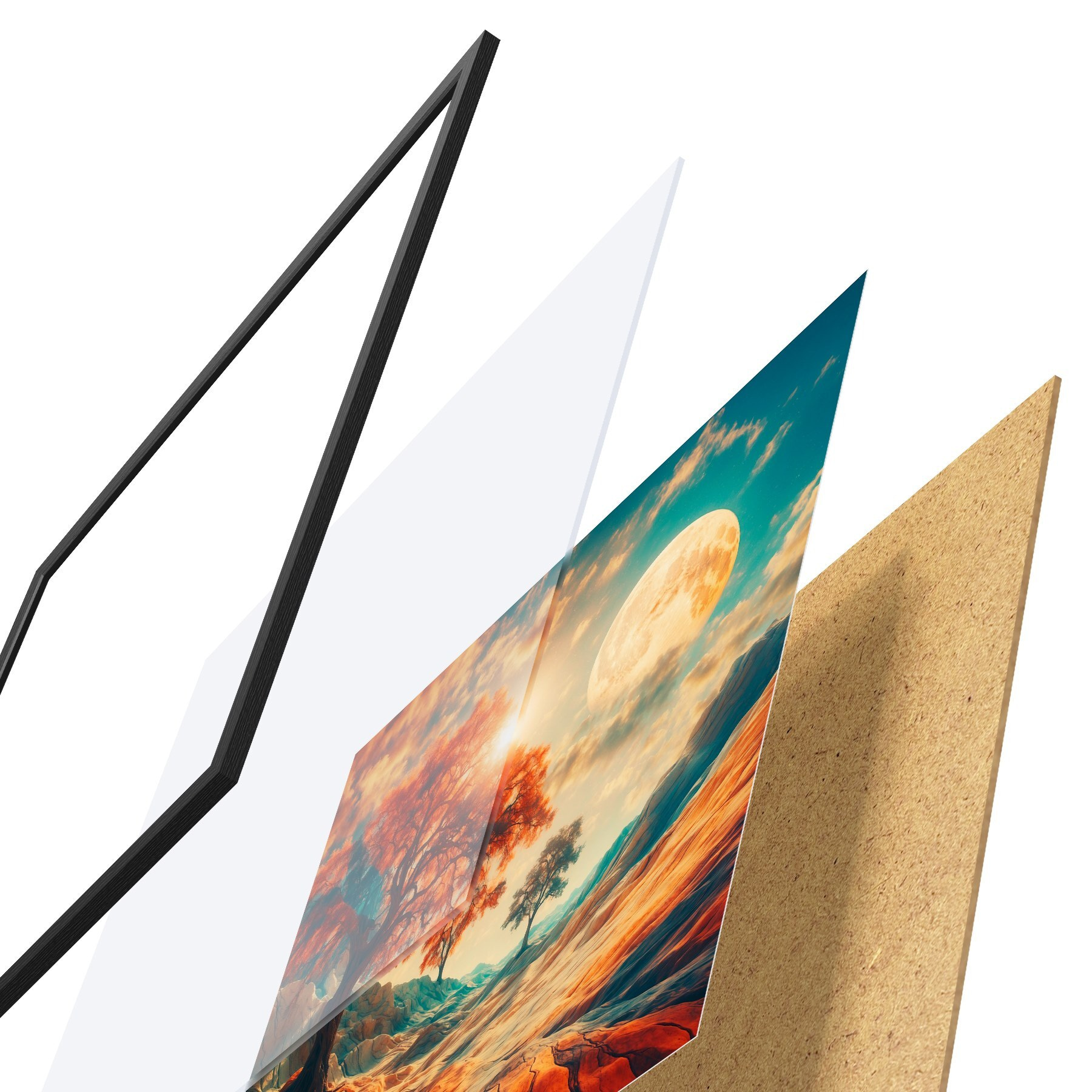 El póster consta de marco, plexiglás, imagen impresa y soporte de aglomerado. El póster puede colgarse inmediatamente en la pared gracias a los soportes de la parte posterior.