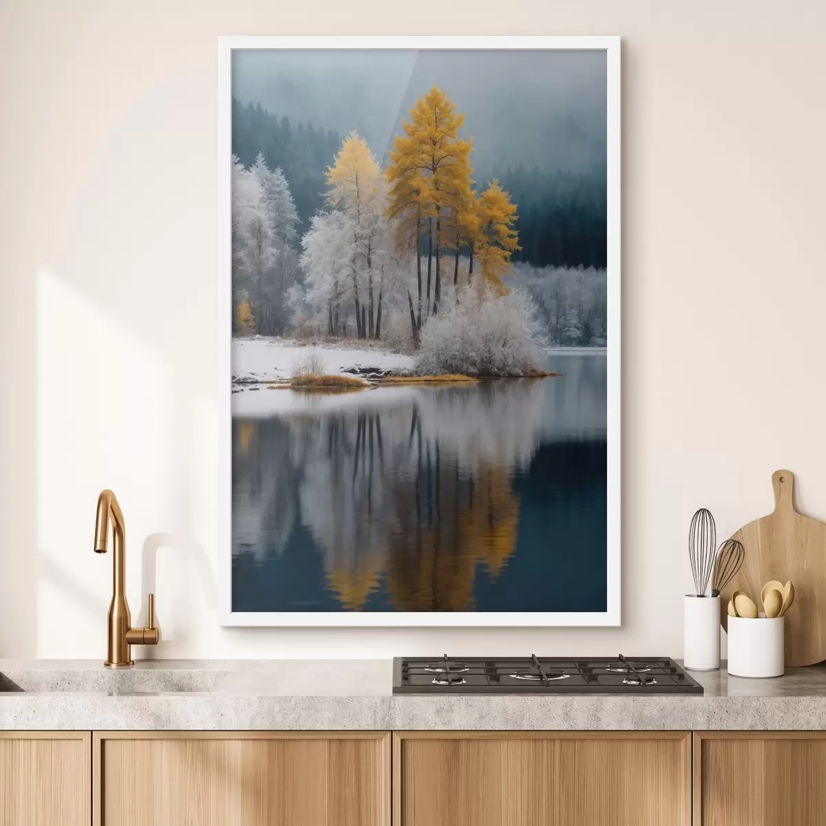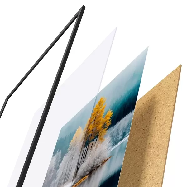 El póster consta de marco, plexiglás, imagen impresa y soporte de aglomerado. El póster puede colgarse inmediatamente en la pared gracias a los soportes de la parte posterior.
