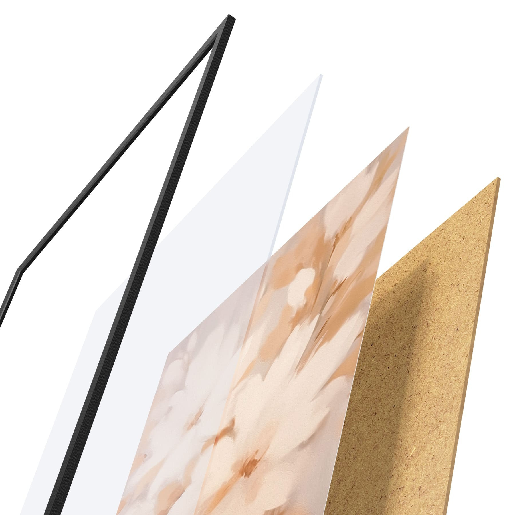 El póster consta de marco, plexiglás, imagen impresa y soporte de aglomerado. El póster puede colgarse inmediatamente en la pared gracias a los soportes de la parte posterior.