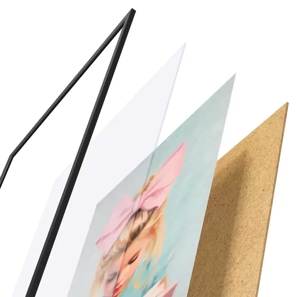 El póster consta de marco, plexiglás, imagen impresa y soporte de aglomerado. El póster puede colgarse inmediatamente en la pared gracias a los soportes de la parte posterior.