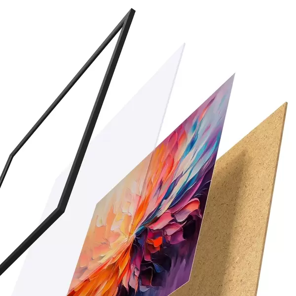 El póster consta de marco, plexiglás, imagen impresa y soporte de aglomerado. El póster puede colgarse inmediatamente en la pared gracias a los soportes de la parte posterior.