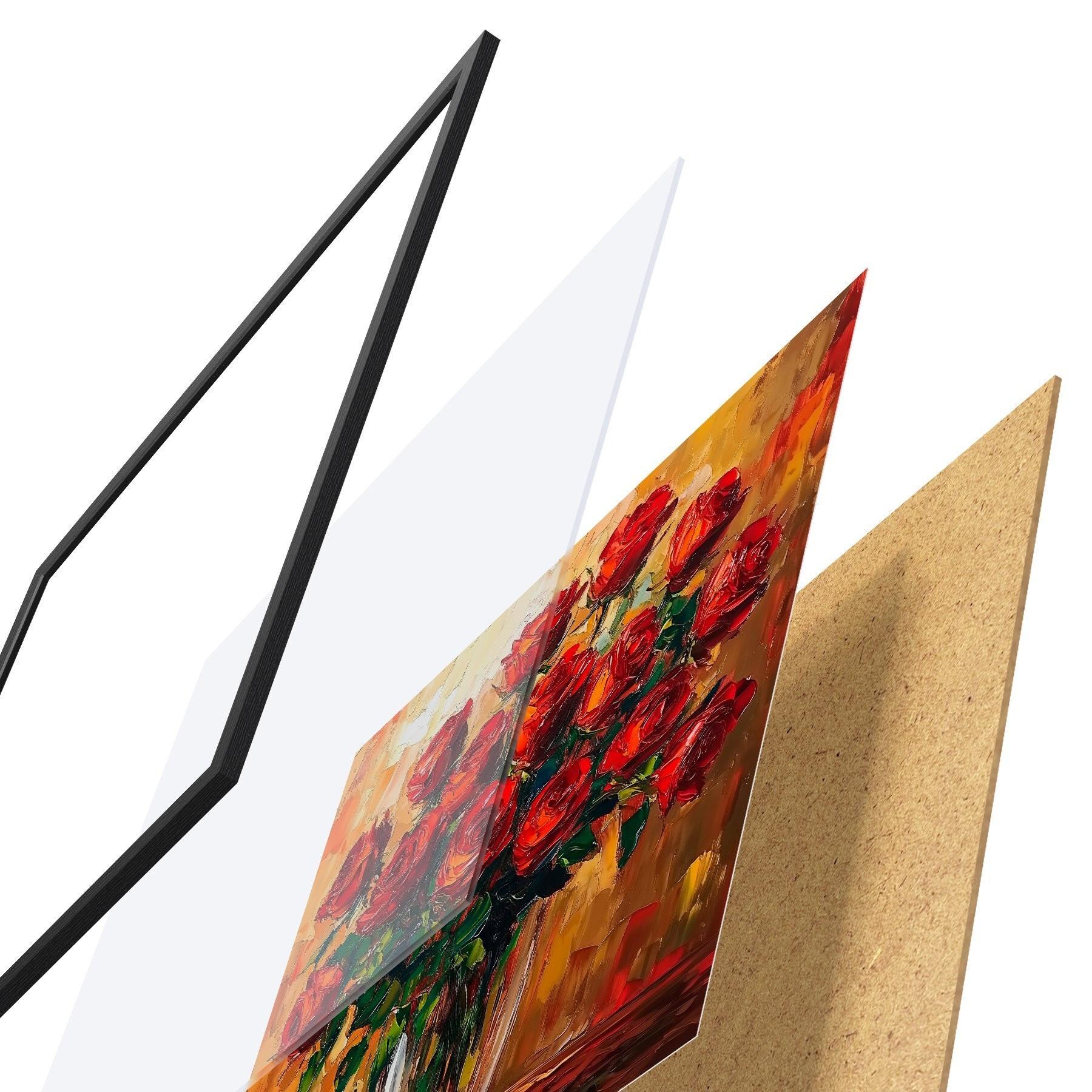 El póster consta de marco, plexiglás, imagen impresa y soporte de aglomerado. El póster puede colgarse inmediatamente en la pared gracias a los soportes de la parte posterior.
