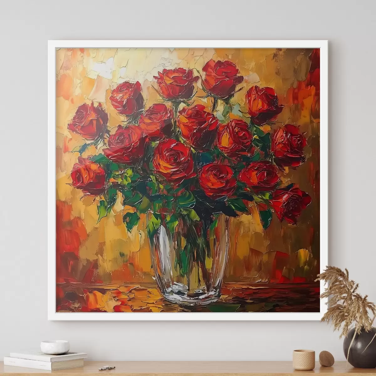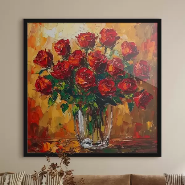 Poster Rosas rojas en un jarrón transparente sobre un fondo cálido f41816