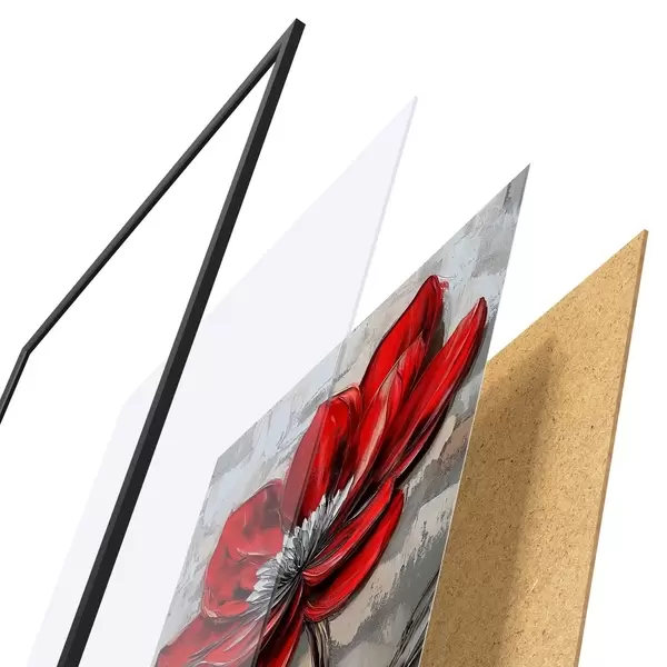 El póster consta de marco, plexiglás, imagen impresa y soporte de aglomerado. El póster puede colgarse inmediatamente en la pared gracias a los soportes de la parte posterior.