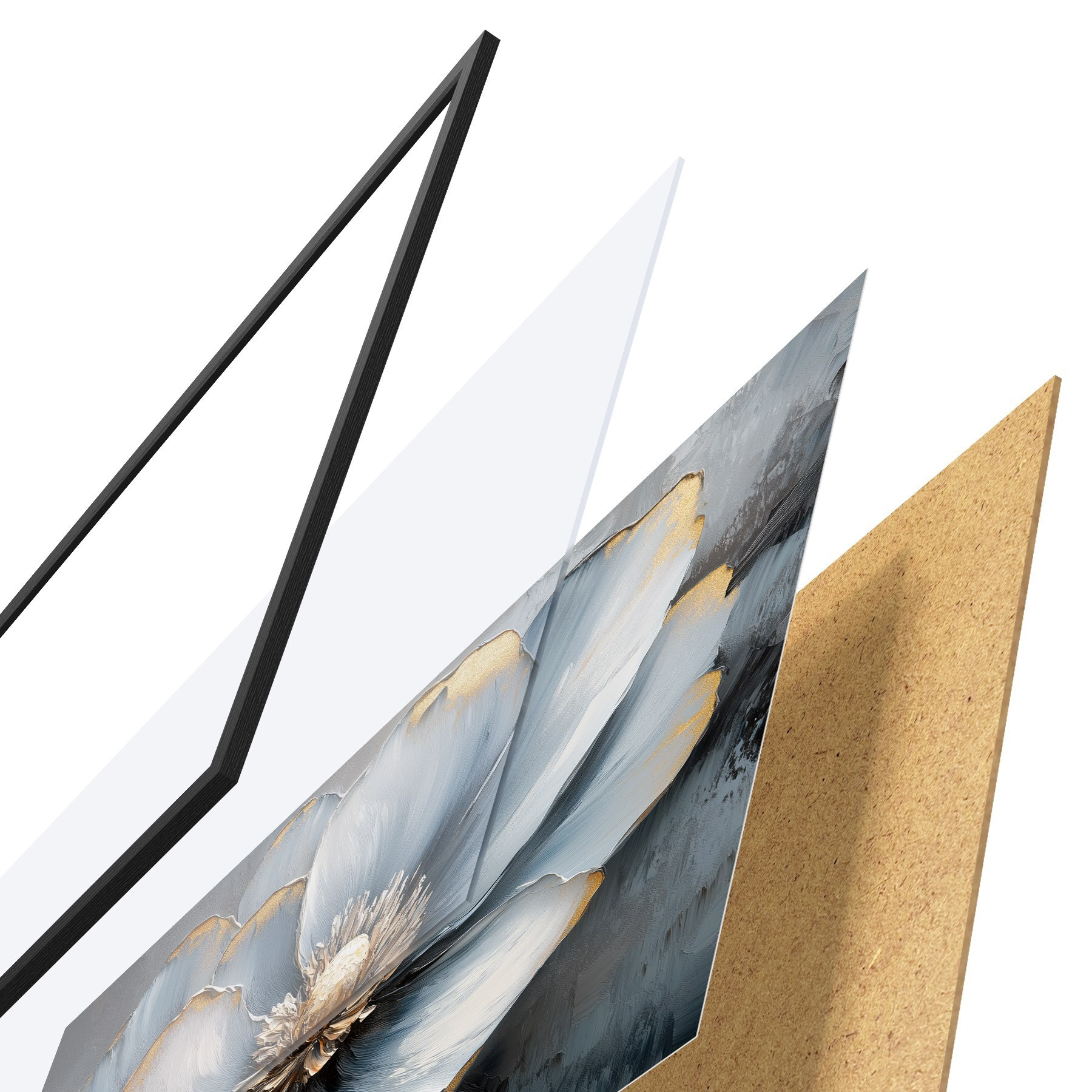 El póster consta de marco, plexiglás, imagen impresa y soporte de aglomerado. El póster puede colgarse inmediatamente en la pared gracias a los soportes de la parte posterior.