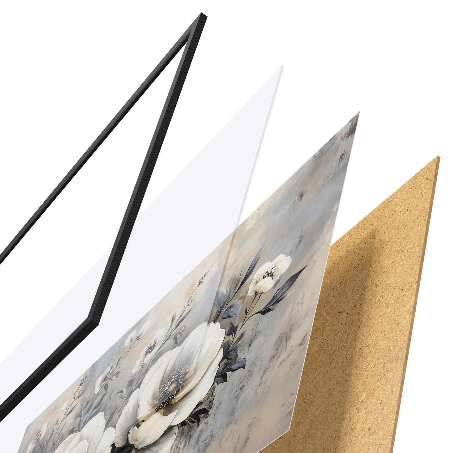 El póster consta de marco, plexiglás, imagen impresa y soporte de aglomerado. El póster puede colgarse inmediatamente en la pared gracias a los soportes de la parte posterior.