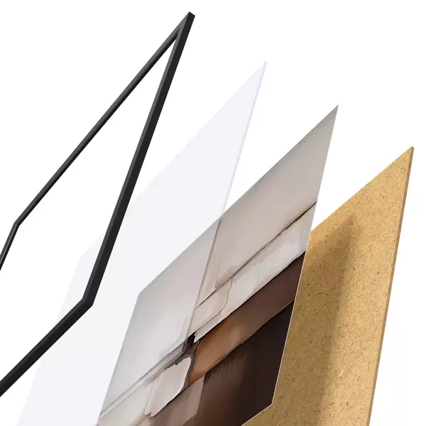 El póster consta de marco, plexiglás, imagen impresa y soporte de aglomerado. El póster puede colgarse inmediatamente en la pared gracias a los soportes de la parte posterior.