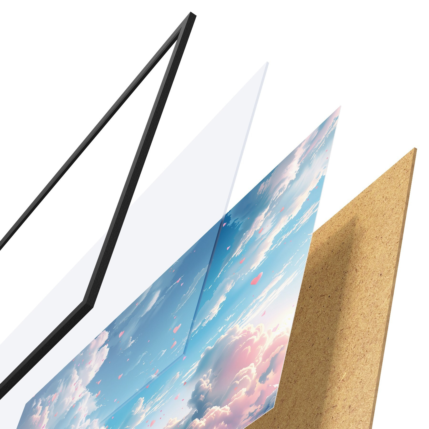 El póster consta de marco, plexiglás, imagen impresa y soporte de aglomerado. El póster puede colgarse inmediatamente en la pared gracias a los soportes de la parte posterior.